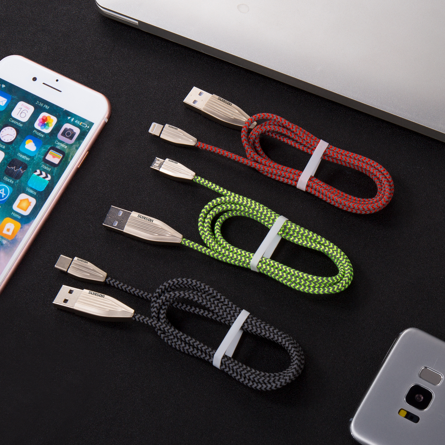 本產品為專利產品,外觀編織層采用高感應反光材料,四種顏色可選,在弱光條件下聚光放射,呈現炫彩效果,插頭采用鋅合金一體插頭,整體渾然一體有濃重的金屬感與科技感,大氣穩重.產品抗暴力使用,防水濺,耐高溫,產品支持閃充標準,傳輸數據充電迅速.
