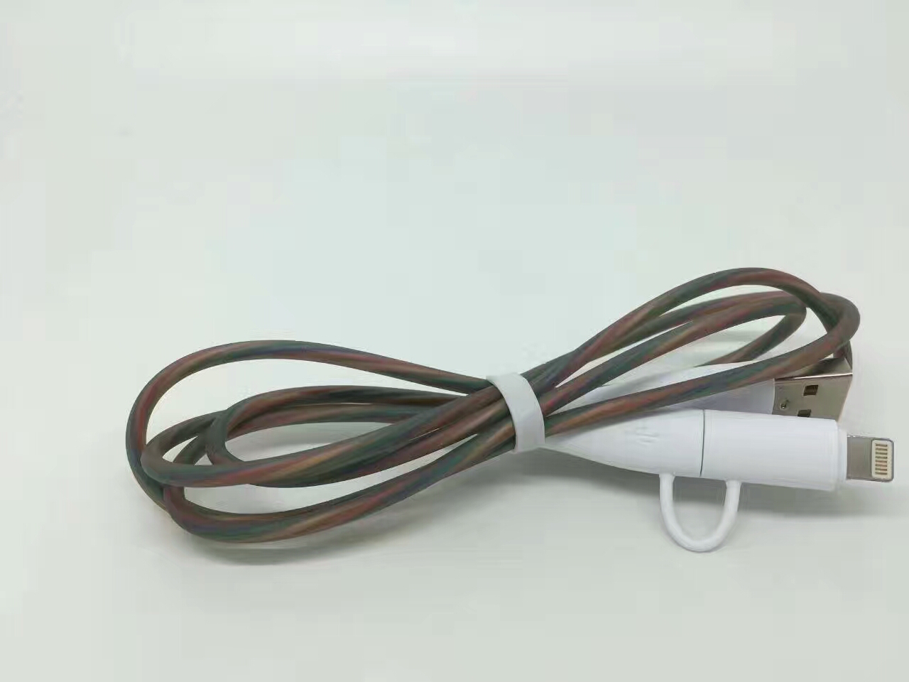 本產(chǎn)品外被為透明TPE環(huán)保材料,顏色呈現(xiàn)多彩,插頭使用iPhone和安卓接口2合1,使用轉(zhuǎn)化方便,產(chǎn)品支持2.1安閃充,充電速度快,插頭造型外觀專利,牢固可靠.